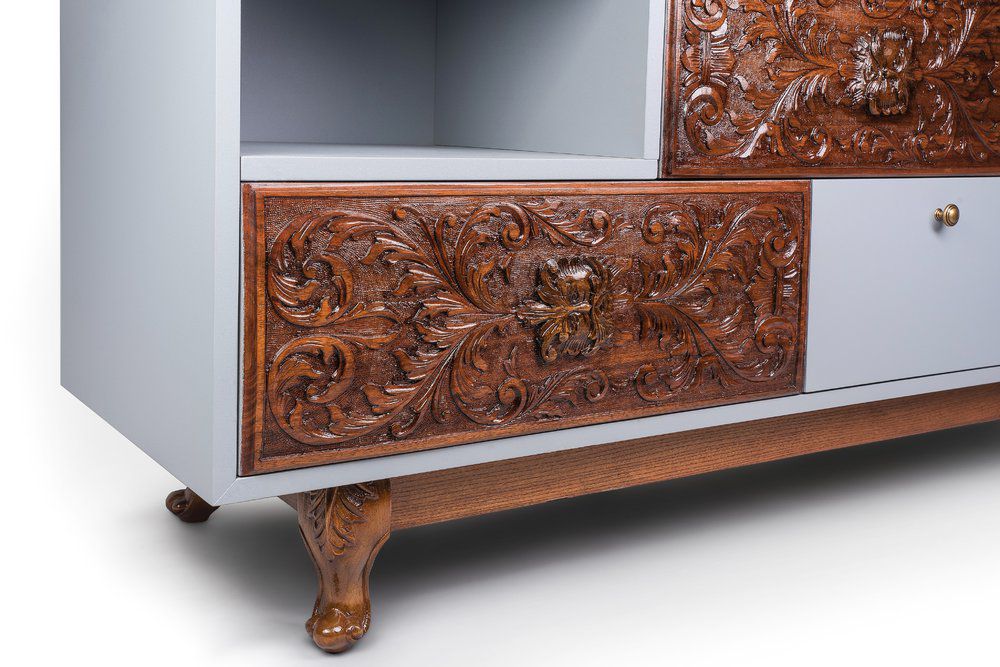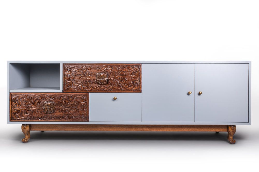 Legújabb munkám ez az antik részletekkel gazdagított modern sideboard. A bútor egyfajta újrahasznosítás . A faragott elemek egy nagyon rossz állapotú régi bútor darabjai voltak. Lomtalanítás közben ihlettek meg egy antik és modern fúzió elkészítésére.